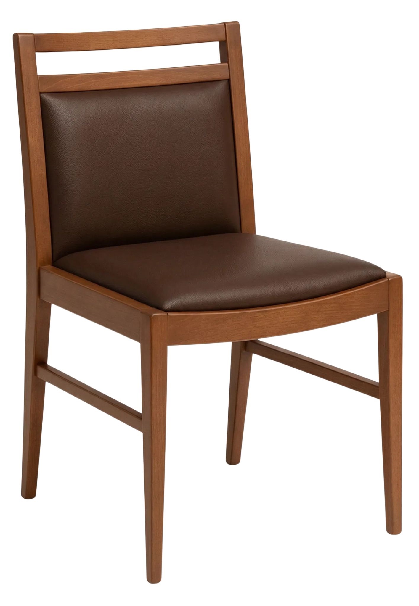 Modelo da Linha Magna com estrutura em madeira maciça, assento e encosto estofados e desenho mais limpo e contemporâneo. Une conforto firme, resistência profissional e fácil manutenção, sendo ideal para restaurantes, churrascarias e ambientes comerciais de uso intenso.