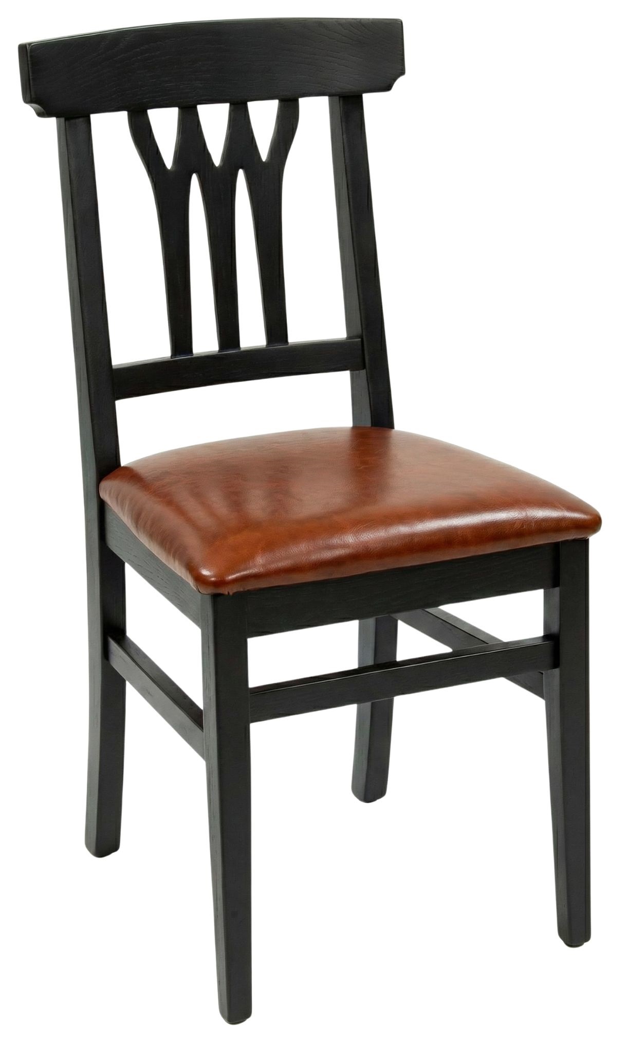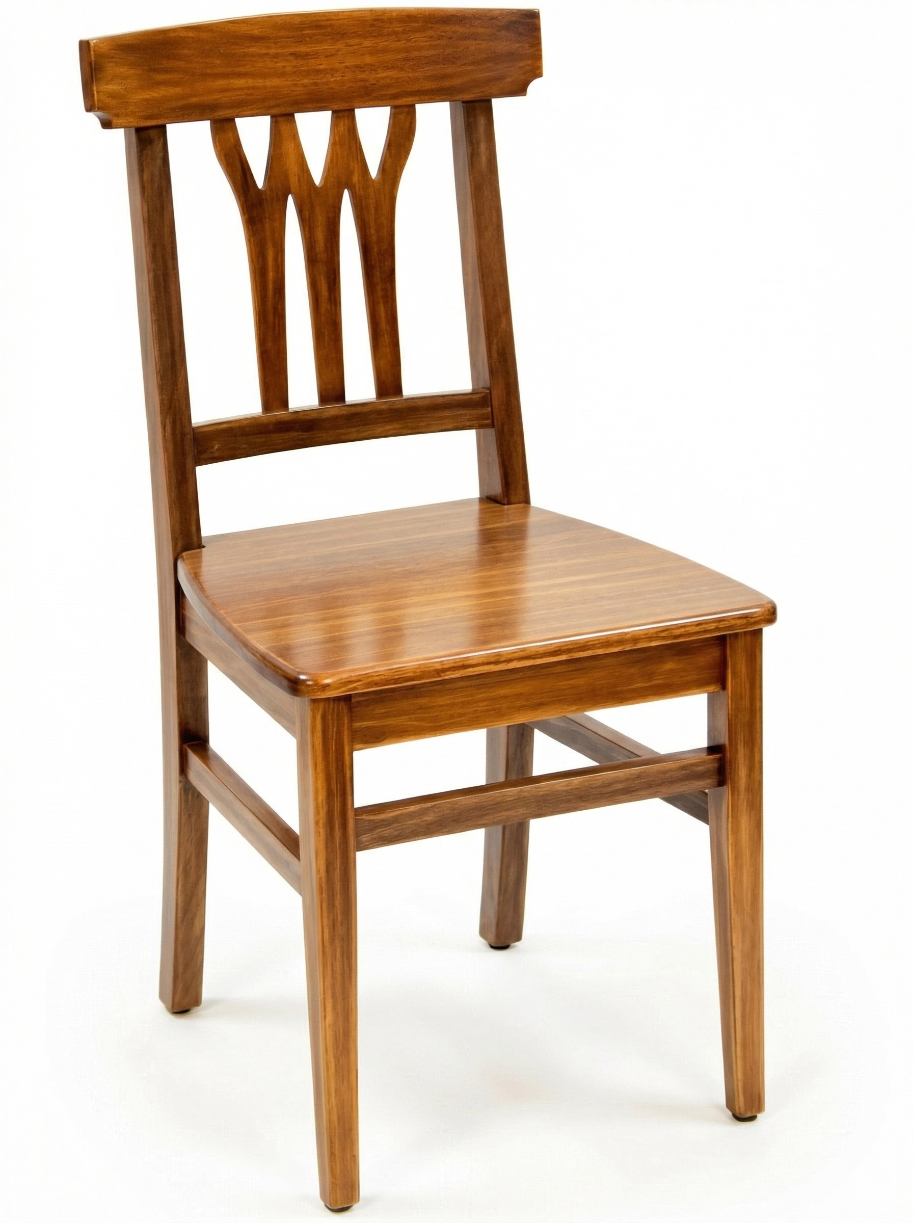 Modelo da Linha Américas com estrutura em madeira maciça, encosto vazado de desenho marcante e assento estofado easy-clean. Une resistência profissional, fácil manutenção e visual clássico para uso intenso em restaurantes, churrascarias e ambientes comerciais.